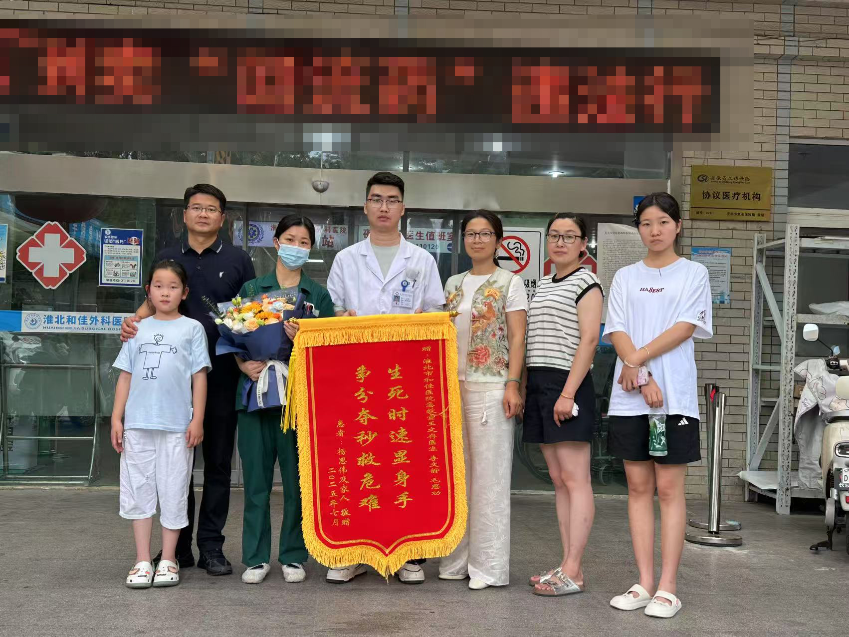 现患者病情稳定,已可正常进餐及行走。患者家属为表示感激特送我院急救人员锦旗一面。